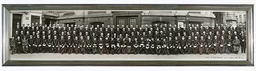 Le corps des policiers communaux molenbeekois devant la Maison communale / Het Molenbeeks gemeentelijk politiekorps voor het gemeentehuis, photo / foto, vers / rond 1939, MoMuse, don / gift Marc Crokaert V 2016.022. Z6, V3C, 13