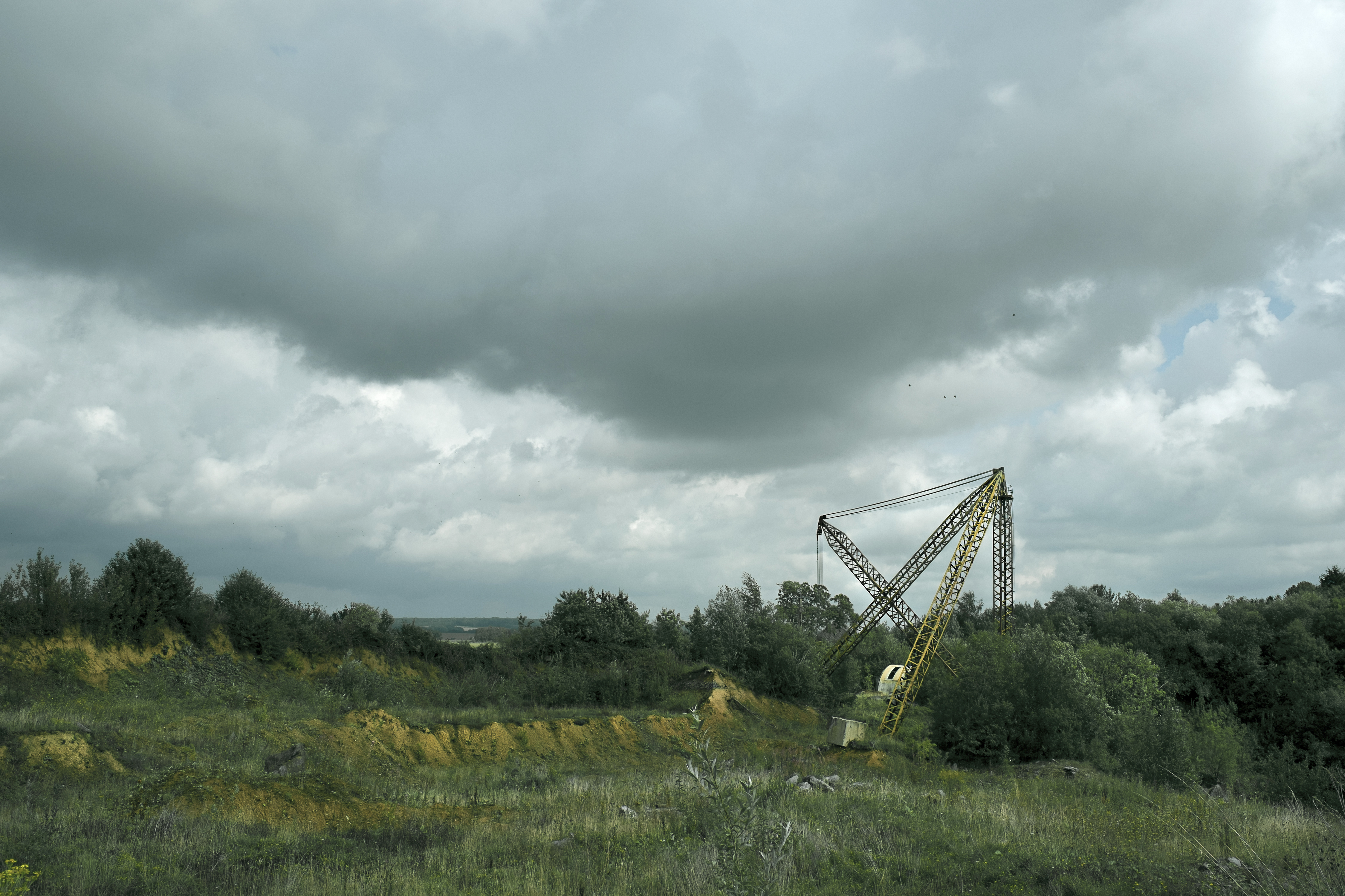 Photographie de paysage, une carrière, Belgique, Condroz. Paysage nuageux, grue jaune.